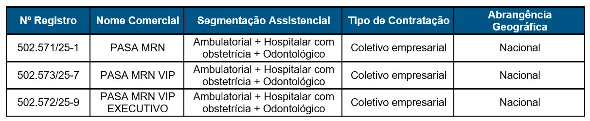 Desta forma, informamos que a partir de 12 de janeiro de 2026, o seu contrato de credenciamento junto à VALE/PASA contemplará o Plano Empresarial PASA MRN, que possui segmentação: ambulatorial, hospitalar com obstetrícia e odontológica. O novo plano tem abrangência para atendimento nacional.